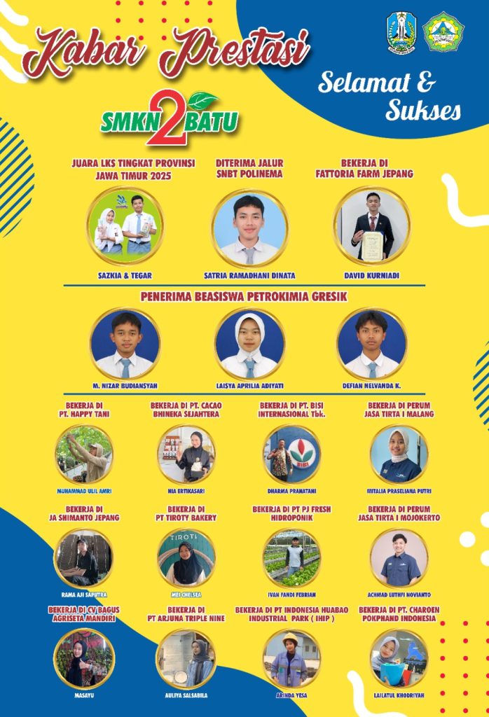 Kabar Prestasi, Tahun 2025 menjadi momen penuh kebanggaan bagi keluarga besar SMKN 2 Batu. Berbagai prestasi berhasil diraih oleh siswa-siswi dari berbagai jurusan, mulai dari kemenangan lomba keahlian, diterima di perguruan tinggi negeri, hingga bekerja di perusahaan dalam dan luar negeri. Hal ini menjadi bukti nyata bahwa SMKN 2 Batu terus mencetak lulusan yang berkompeten dan siap bersaing di dunia kerja maupun pendidikan tinggi.