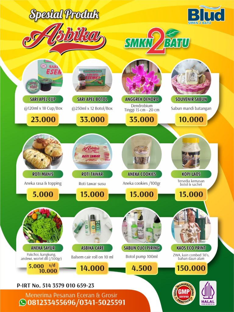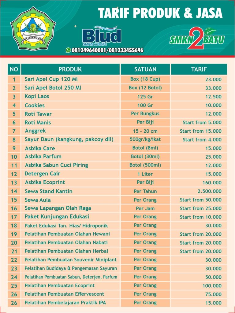 SMKN 2 Batu melalui program BLUD (Badan Layanan Umum Daerah) mempersembahkan beragam produk kreatif dan layanan jasa pendidikan yang siap memenuhi kebutuhan Anda!